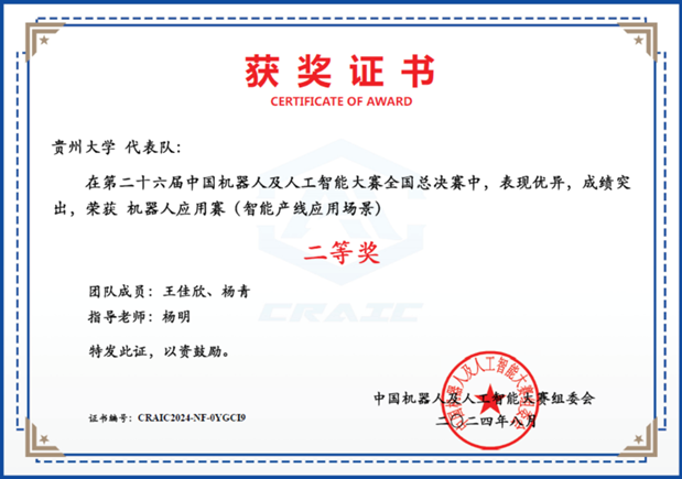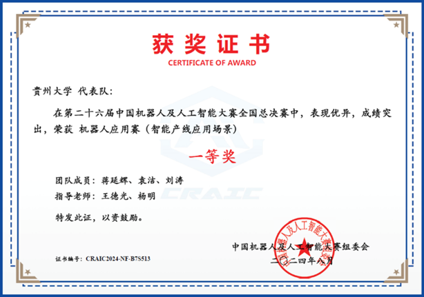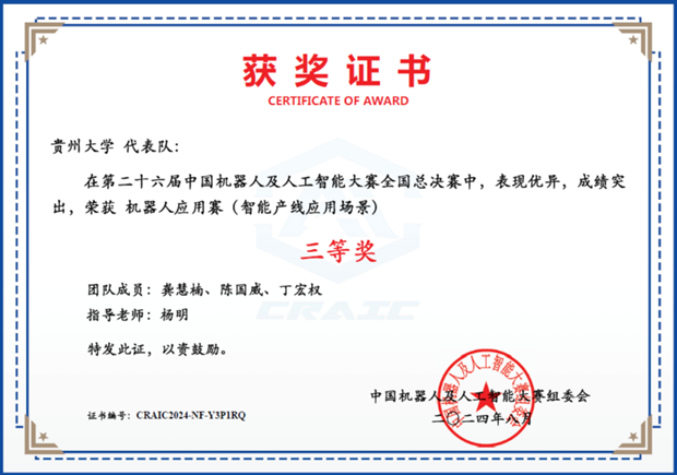 2024年8月25日,第26屆中國機(jī)器人及人工智能大賽的全國決賽在江蘇宜興圓滿結(jié)束。比賽期間,來自清華大學(xué)、哈爾濱工業(yè)大學(xué)、浙江大學(xué)等208所高校的407支隊(duì)伍1300余名選手,圍繞自動駕駛、機(jī)器人、人工智能等領(lǐng)域的前沿技術(shù)應(yīng)用與實(shí)踐進(jìn)行技術(shù)交流、切磋并展開激烈對決。我院參賽團(tuán)隊(duì)在楊明和王德光兩位老師指導(dǎo)下,團(tuán)隊(duì)成員積極創(chuàng)新、齊心協(xié)力、不懈努力下,最終,代表貴州大學(xué)取得國賽一等獎1項(xiàng)、國賽二等獎1項(xiàng)、國賽三等獎1項(xiàng)、省賽二等獎2項(xiàng)的歷史最好成績。