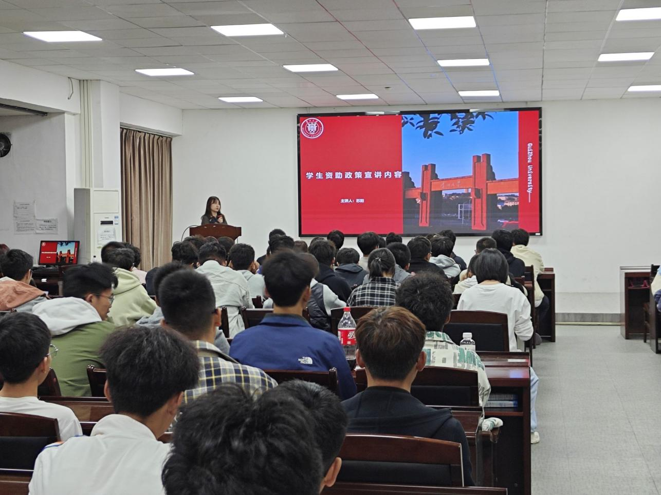 宣講現場,蘇陽首先從開展資助工作的重要意義、資助政策、本校資助體系、學生受助情況、資助工作的開展以及凸顯育人成效等方面進行講解,同時對班委如何開展資助工作提出具體要求。隨后,羅鑫要求各班認真組織學習資助政策,務必把會議內容精準傳達到每位同學。