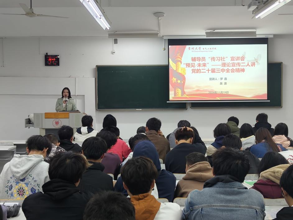 為深入學習貫徹黨的二十屆三中全會精神,加強2024級學生對黨的知識理論的學習,電氣工程學院于2024年11月19日在東樓303D舉辦了輔導員“傳習社”宣講會——“預見·未來”理論宣傳二人講活動。本次活動由2024級輔導員羅鑫老師主持,并與電自222吳浪共同主講,活動現場有80余名同學參加。