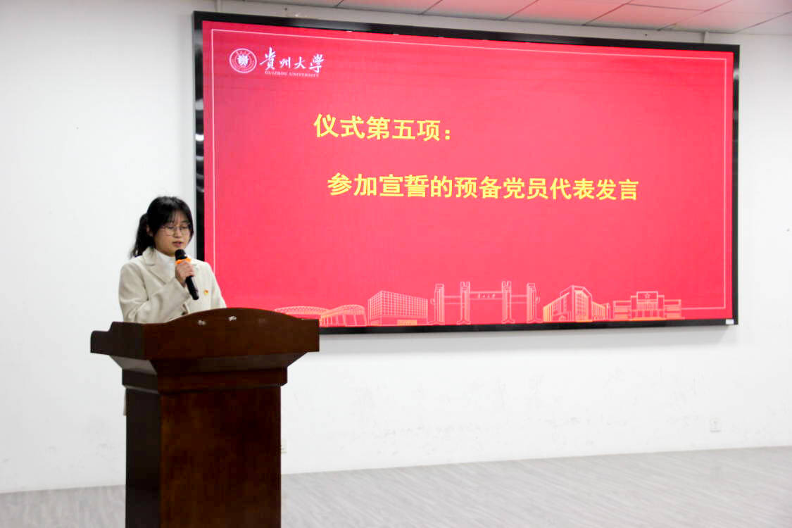 宣誓結束后,預備黨員代表龔慧楠發(fā)言,分享加入中國共產黨的心路歷程和感受,并代表大家表達對黨的忠誠和對共產主義事業(yè)的堅定信仰,并以“青春由磨礪而出彩,人生因奮斗而升華”與在座黨員共勉。